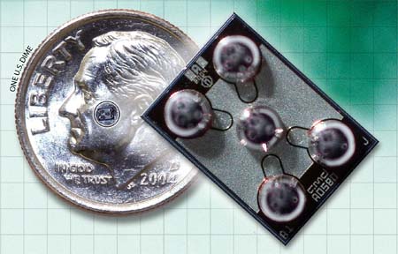 Milpitas, CA -- California Micro Devices today announced the Centurion CM1220 low capacitance Zener diode array for electrostatic discharge (ESD) protection in space saving CSP (chip scale package) format for wireless handsets and LCD modules. Utilizing proprietary Centurion Zener process technology, the CM1220 features a low input capacitance of 14 pF, and protects ESD strikes up to +/-15 kV contact discharge. California Micro Devices' Centurion process provides a higher level of ESD protection with lower input capacitance and dynamic resistance. The CM1220 is offered in 4 and 8 channel configurations.