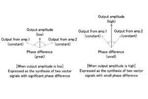 Fujitsu Laboratories has explored the use of outphasing to increase electrical efficiency over a high dynamic range output power. In this method, a transmission signal is first split into two signals with the constant amplitude and opposite phase variations. The amplitude of the signal is set for the amplifier device to work with high conversion efficiency. These signals are amplified by each amplifier device, and then combined via vector synthesis using a power combining circuit to reconstitute the source signal wave form(Figure 2). However, electricity loss in the combining circuit and the high-level of precision required in terms of phase difference when reconstituting the source signal had prevented this technique from being used in radio-frequency wireless communications applications.