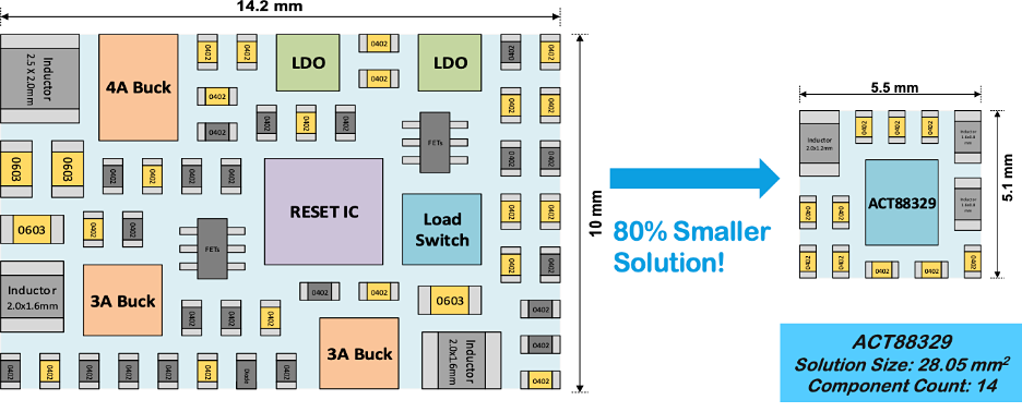 The diagram above illustrates a typical size reduction achieved using a configurable power supply solution.